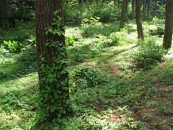 薄っすらと暗い森の中に、柔らかい朝日が差し込み、新緑を鮮やかに照らし出してくれます。