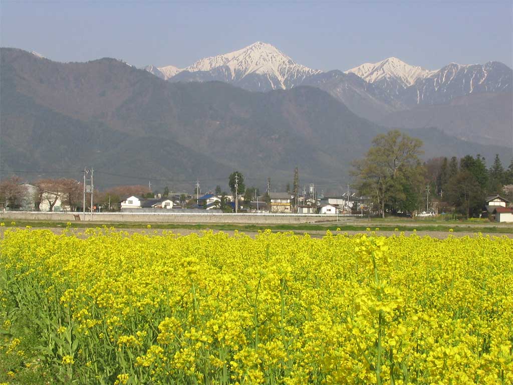 安曇野のシンボルといえる残雪の常念岳をバックに広大に咲き誇る菜の花です。寒い安曇野では、この時期になって、やっと満開を向かえます。