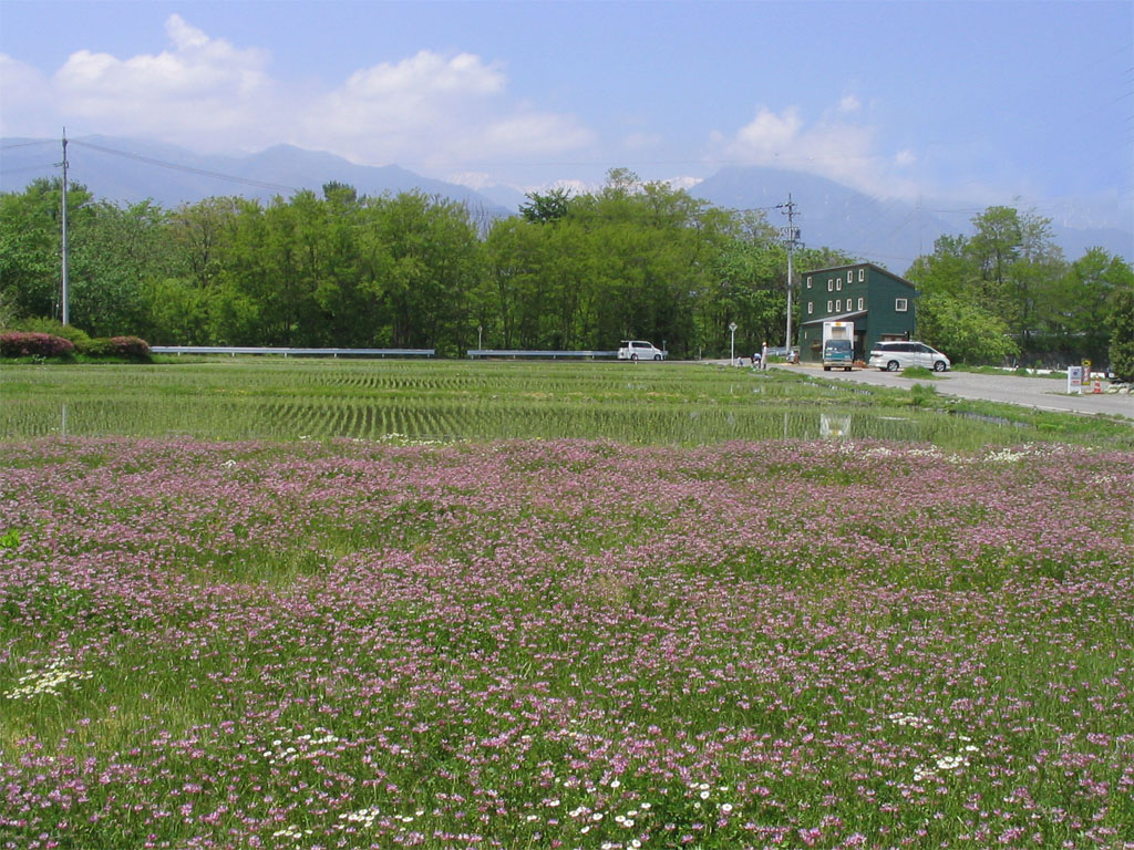 以前に比べレンゲ畑は少なくなりましたが、車通りが少ない場所で、出会えることがあります。のんびりと安曇野散策をして探してみてください。