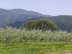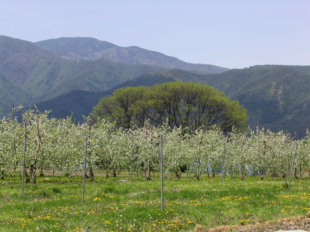安曇野の名産リンゴの畑です。この時期、一斉に可憐な白い花を咲かせます。タンポポの黄色とリンゴの白い花がとても鮮やかです。